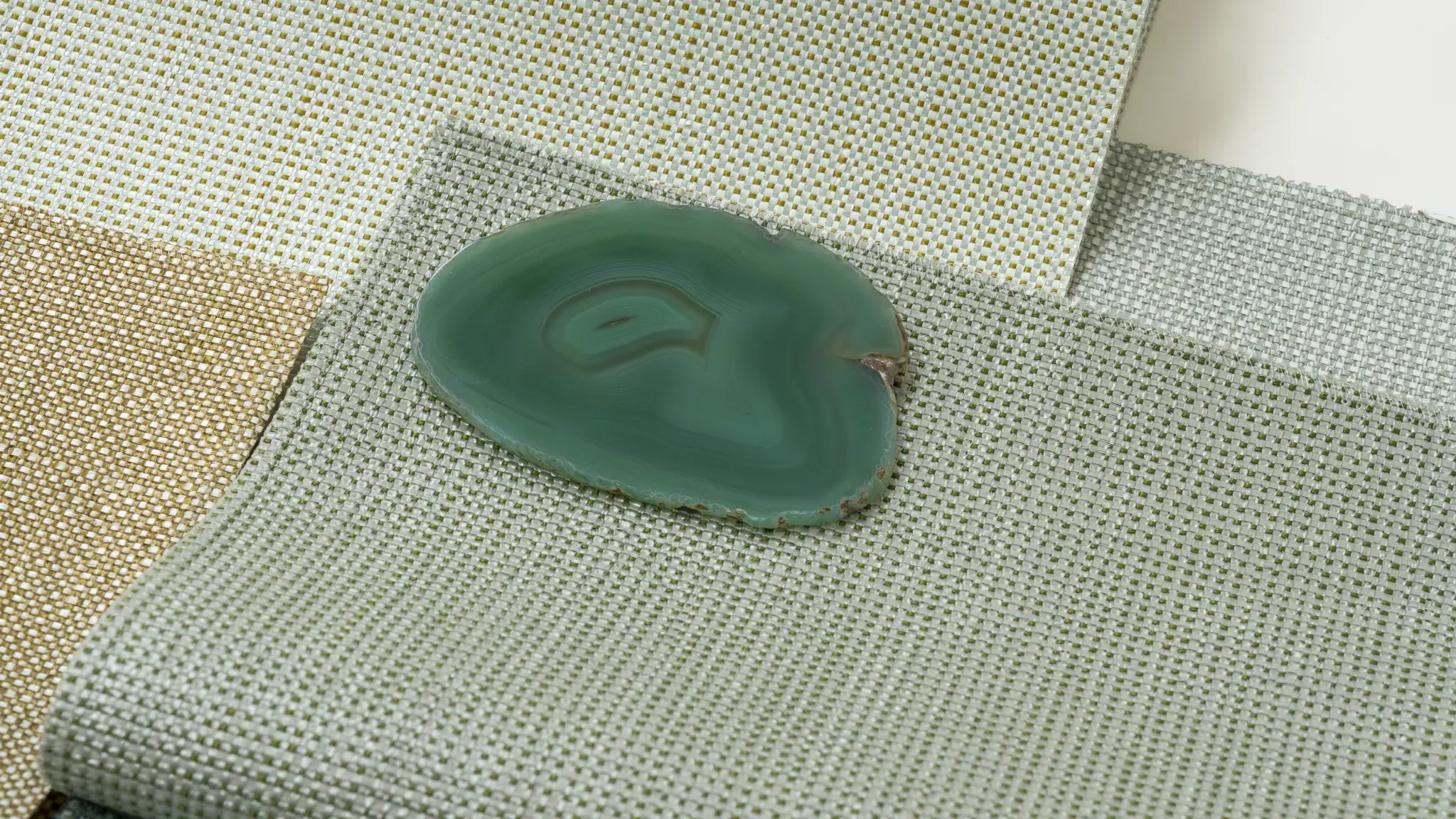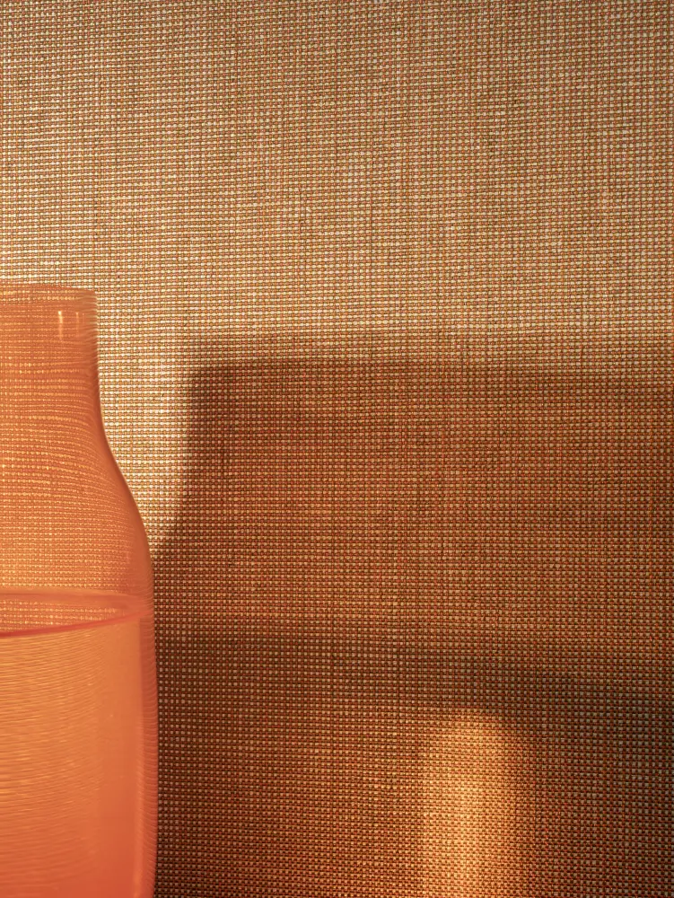 The wallcovering combines polyethylene tape yarn with thin recycled polyester yarn, which softens the lustre, introduces dynamic colour and contributes to a product with 20% recycled content. From pink opal and tiger eye to smoky quartz and sapphire, its wide range of 35 colourways draw from gemstones and coloured glass – and the way they refract and reflect light.