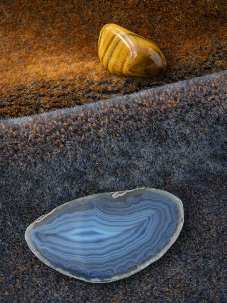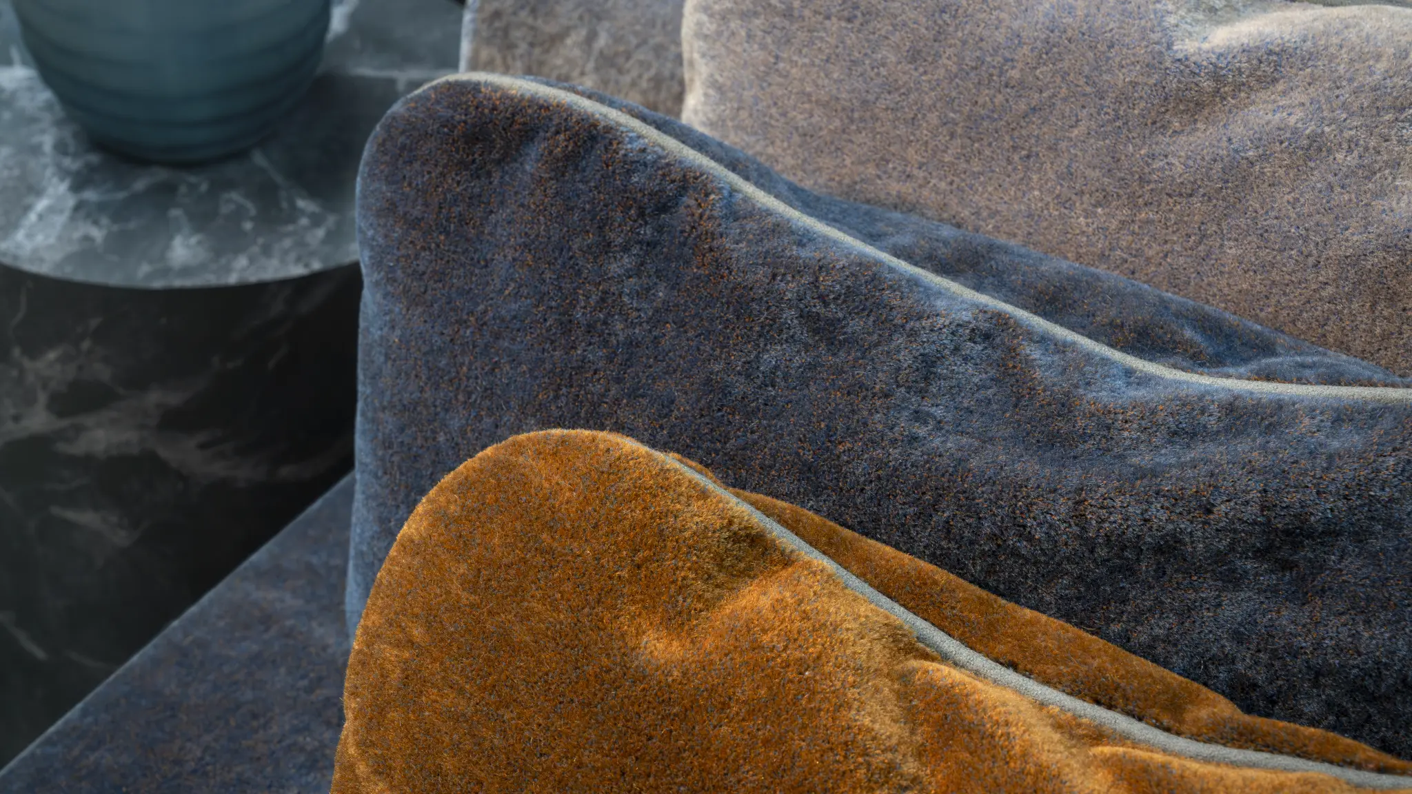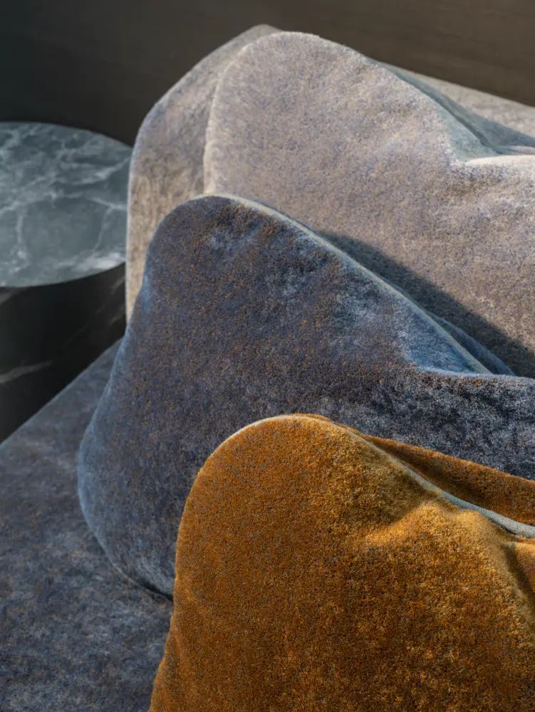 Its 16 distinctive two-tone colourways are created during the dyeing process through the interplay of the materials in its pile composition: 70% mohair and 30% cotton.